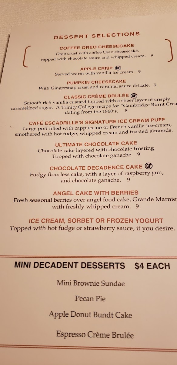 Cafe Escadrille never disappoints!! I got the hot roasted turkey sandwich. I've only ever gotten that, but I can say that it's so good, I can safely assume that everything else must be great! Comes with a open faced sandwich with very tender turkey with a large blob of mashed potatoes, with, by far, the best gravy I have ever tasted. I described it as "pure melted gold." Under the many slabs of turkey, there is stuffing on toast. I had the orange cremecicle cheesecake for dessert, it looks small, but after your hardy meal, I can tell you it is the perfect size. I love coming with my family!! But I can't mention all that they have, it's the type of thing where you just have to explore it for yourself!! Enjoy!!